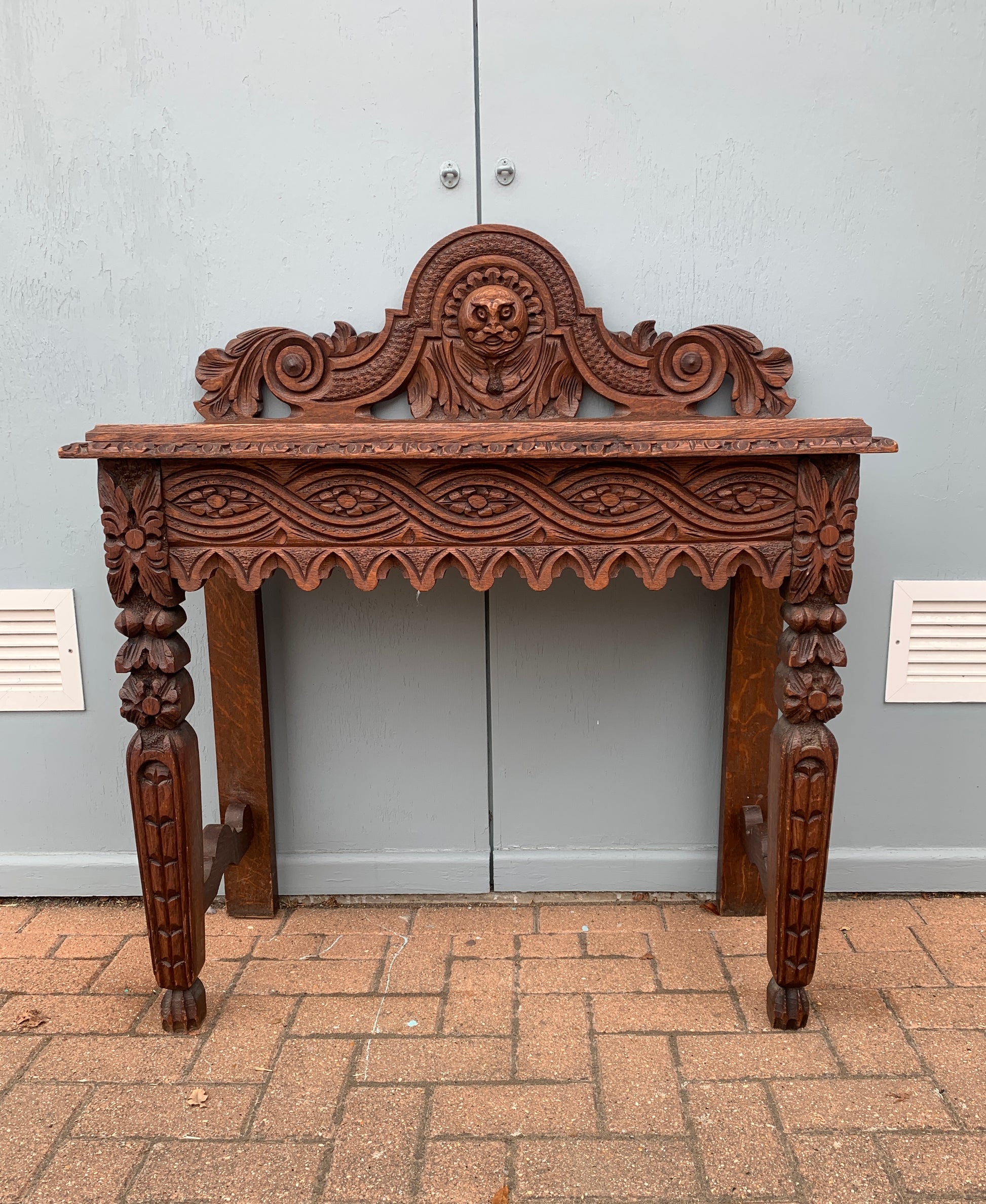 1860's Antique Victorian Carved Oak Console Hall Table with Green Man Motif