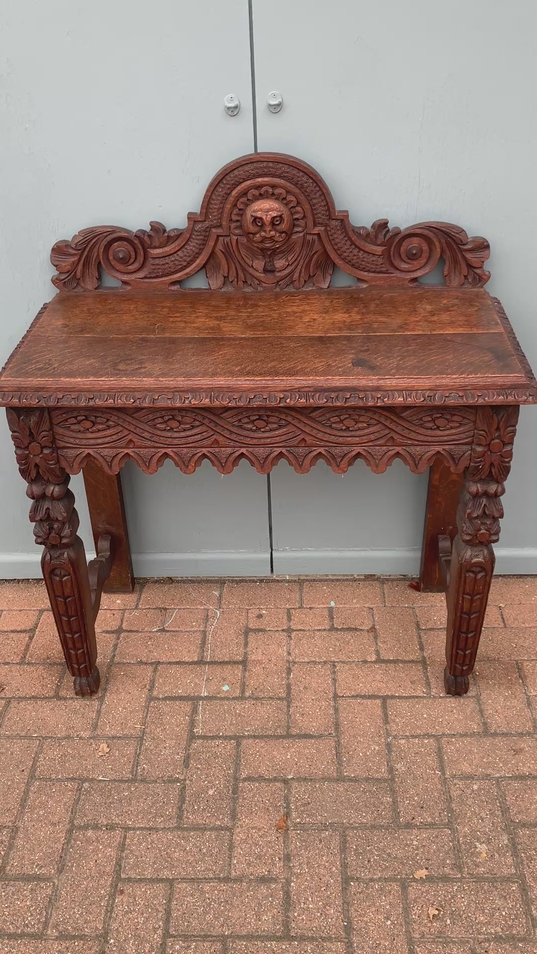 The table is made of carved oak with a shaped back and gallery centred by a Green Man mask. The Green Man is a motif found in art and architecture, often depicting a face surrounded by or made from leaves.