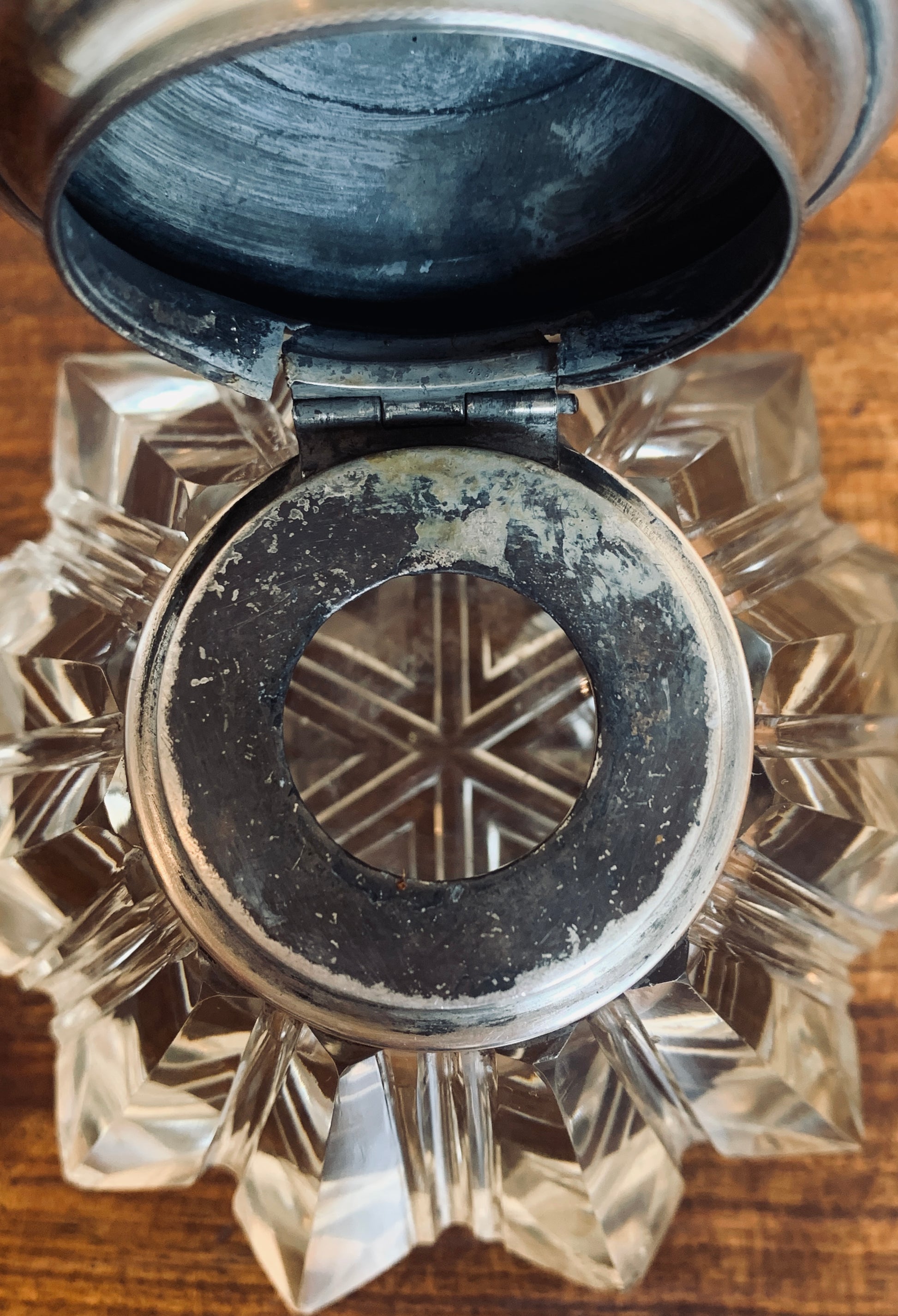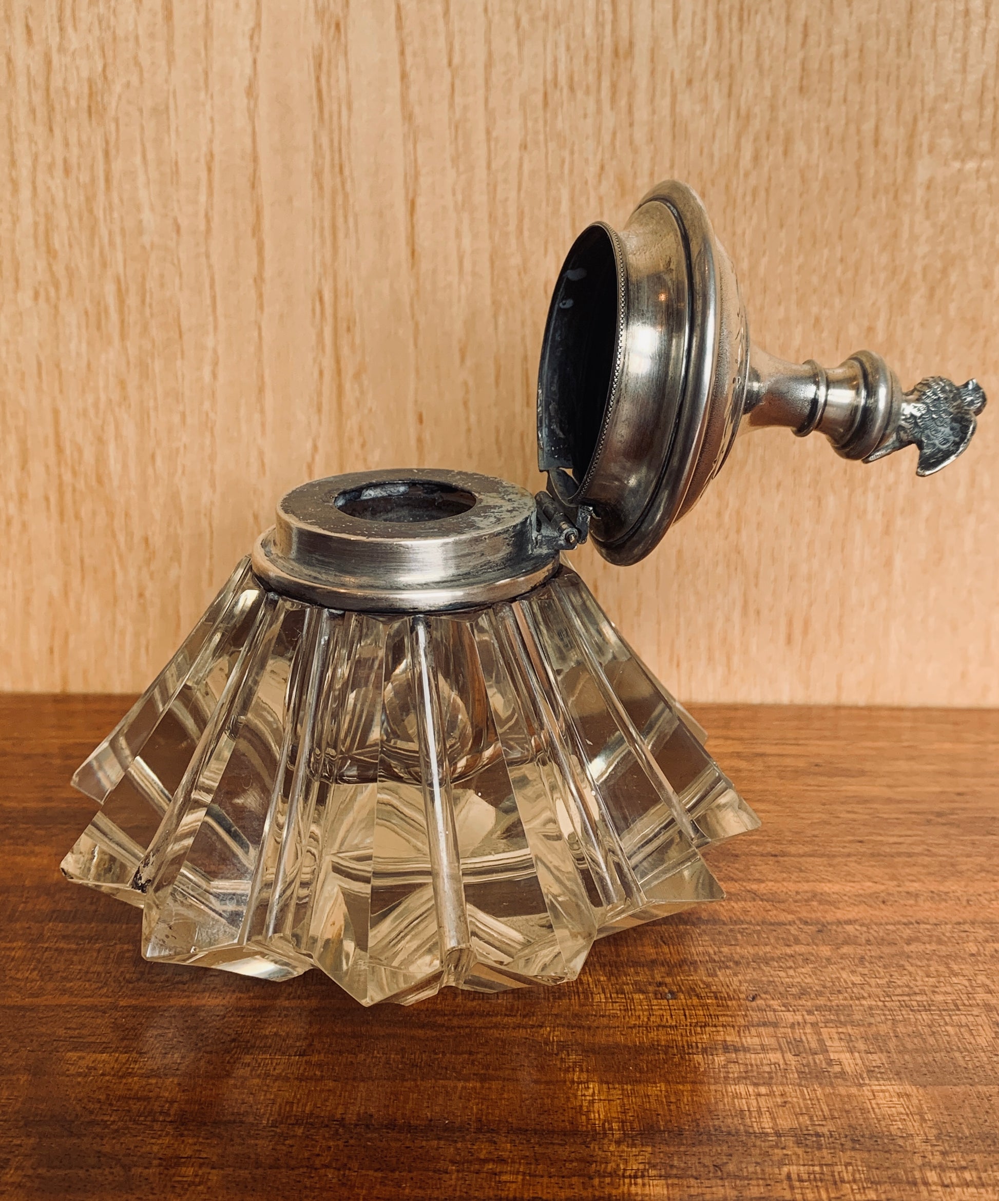 Antique Art Deco Crystal Inkwell with Ornate Silver-Plated Top and Eagle Finial.