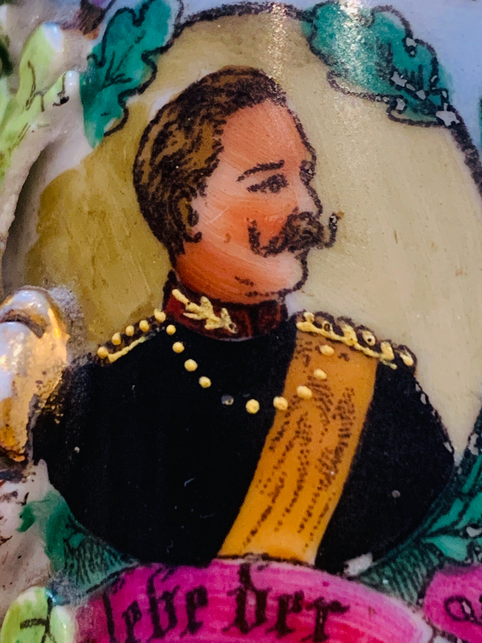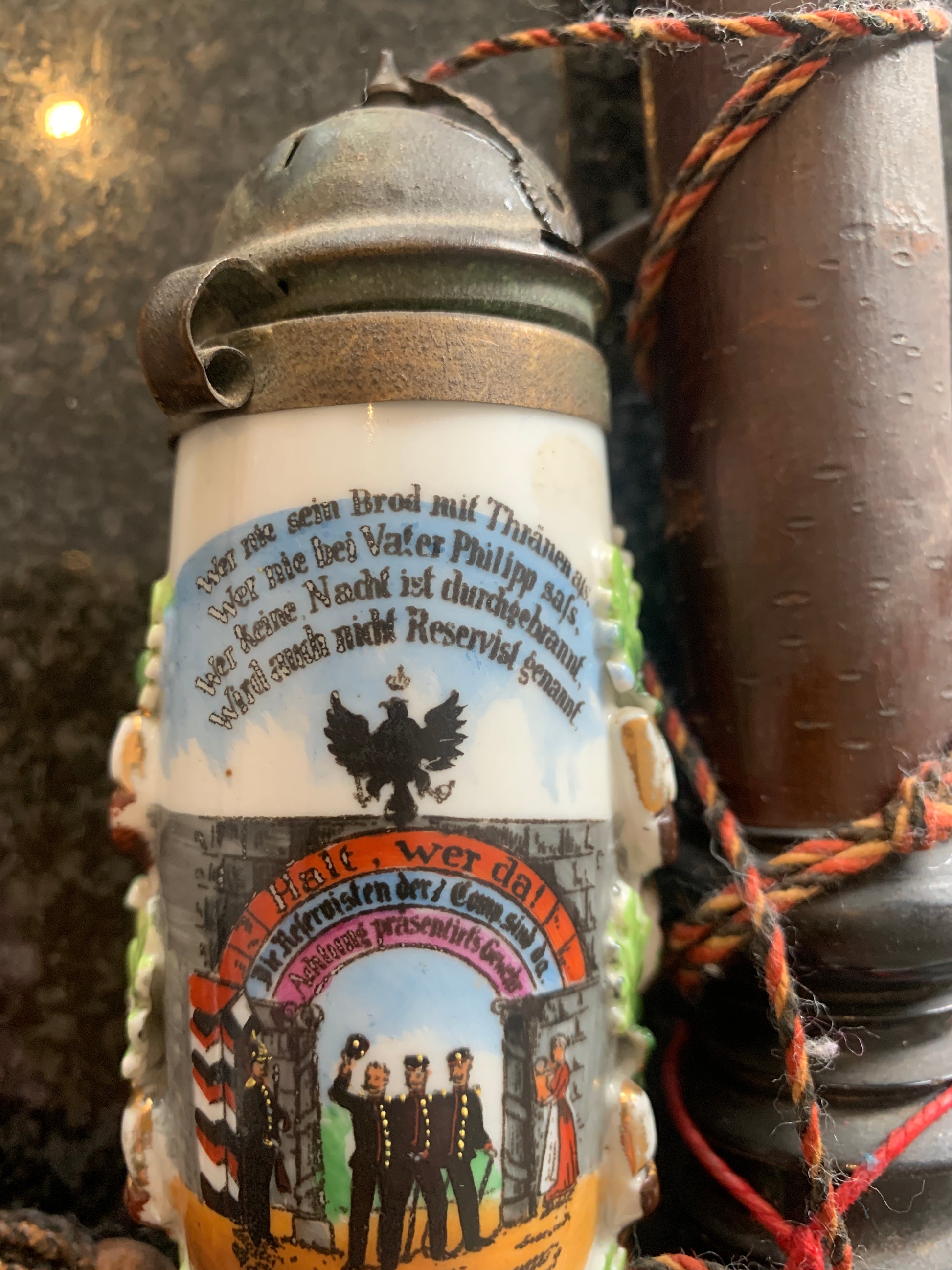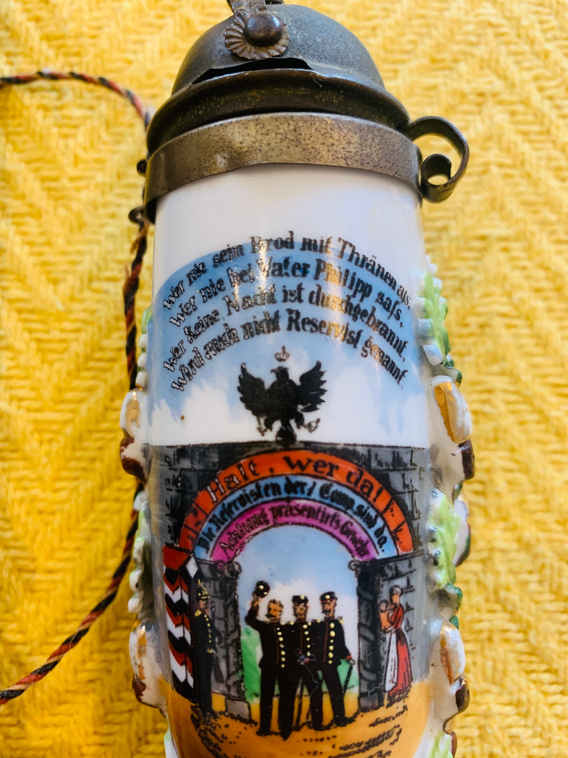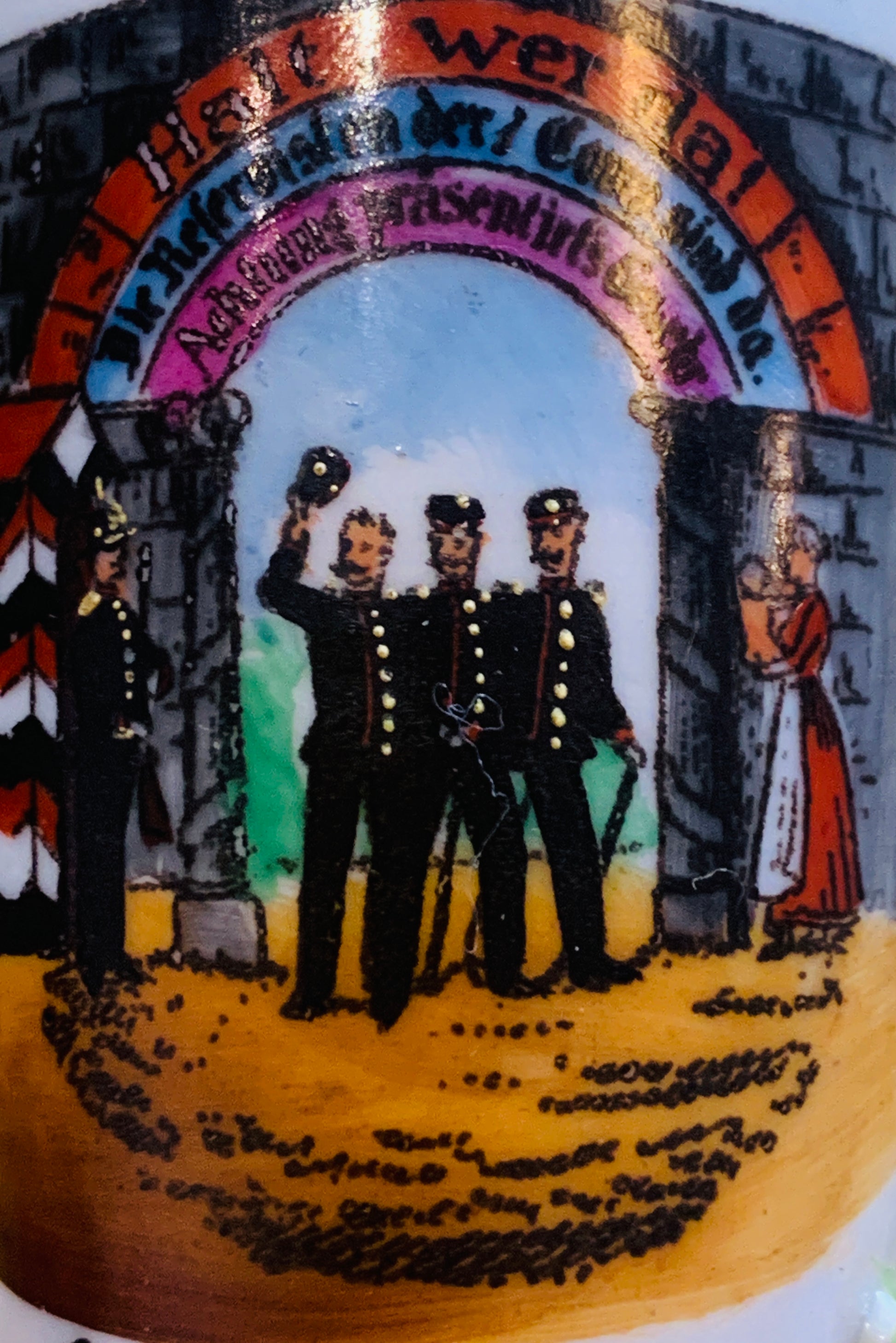 The text on the back of the main porcelain piece, "Zur Erinnerung an meine Dienstzeit", is German for "In remembrance of my time of service." The phrase on the front of the porcelain, above the image of the soldiers, roughly translates to "Whoever has not sat through a tearful night, is also not a reservist."