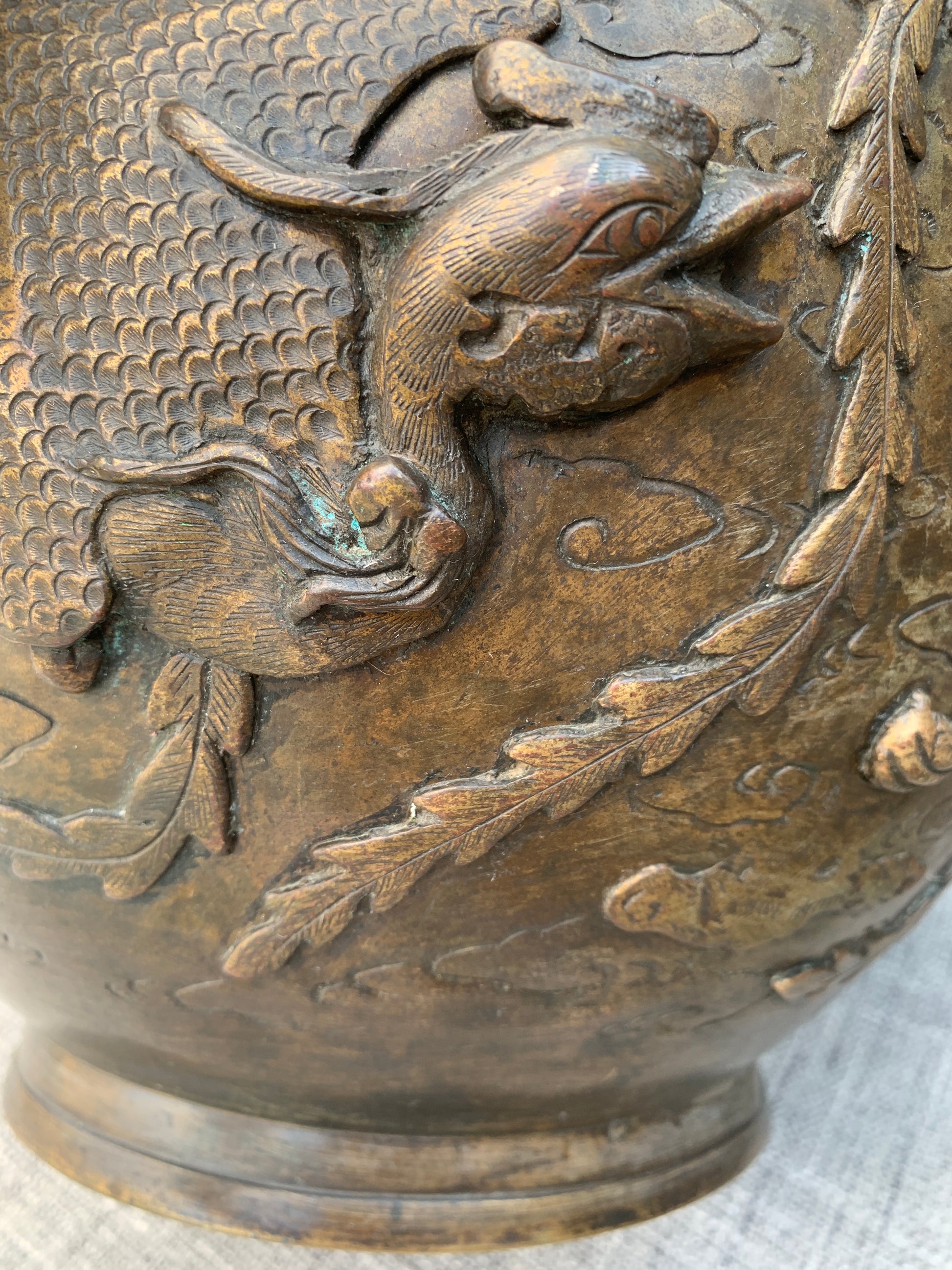 The jardinière features beautifully cast Japanese Phoenix motifs, a classic symbol of good fortune, renewal, and prosperity in Asian mythology. The intricate details of their feathers and flowing forms are truly remarkable, bringing the mythical creatures to life.