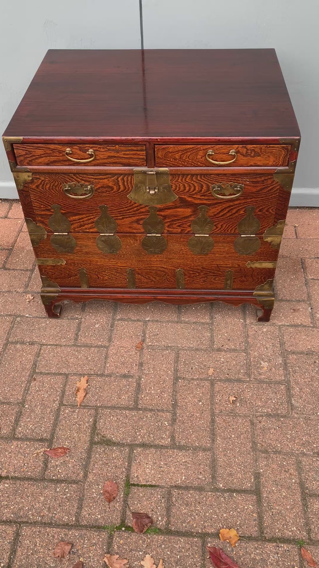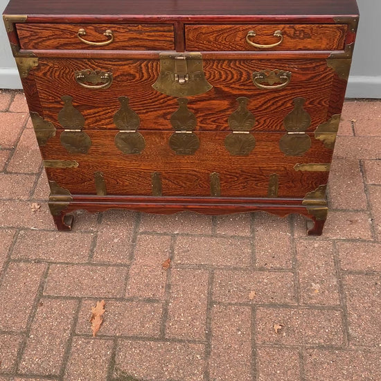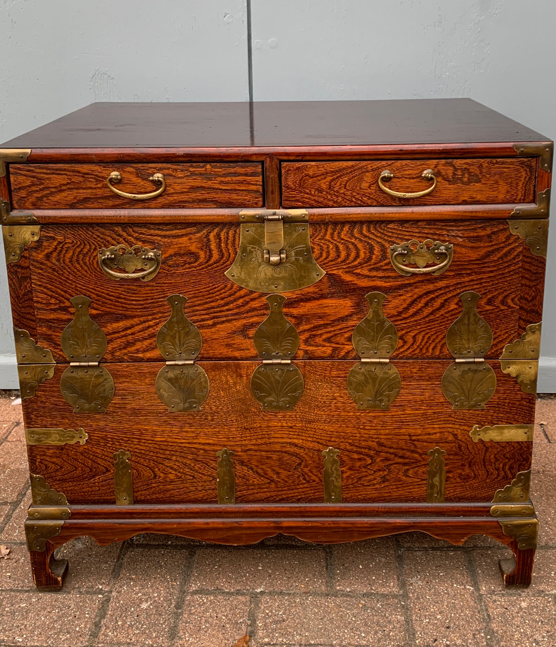 A rare and outstanding traditional Korean storage chest (Bandaji), crafted from rich hardwood and defined by its magnificent, hand-wrought brass hardware. A superb statement piece for the collector or sophisticated interior.