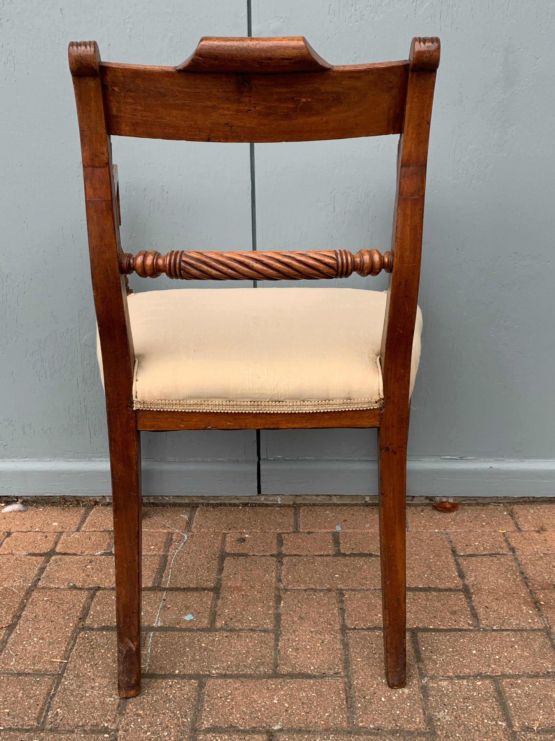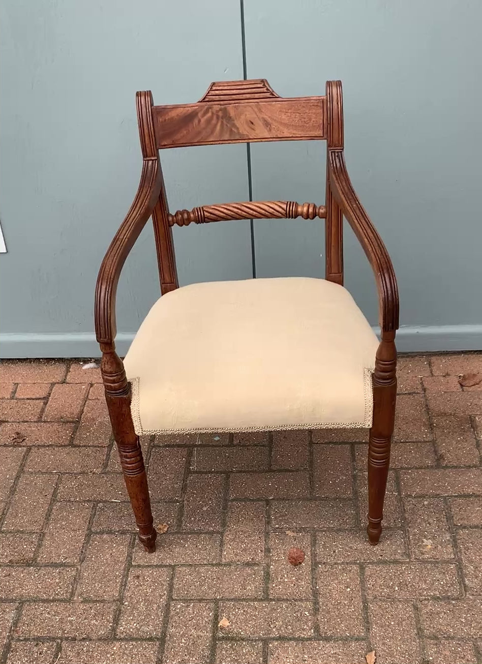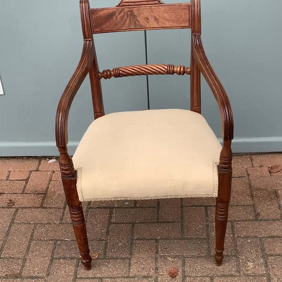 This Regency Period (1811-1820) mahogany chair features a carved wooden back, curved arms, and turned front legs. The back has a carved top rail and a distinctive turned or reeded crossbar. The seat is a drop-in style, which is upholstered and padded.