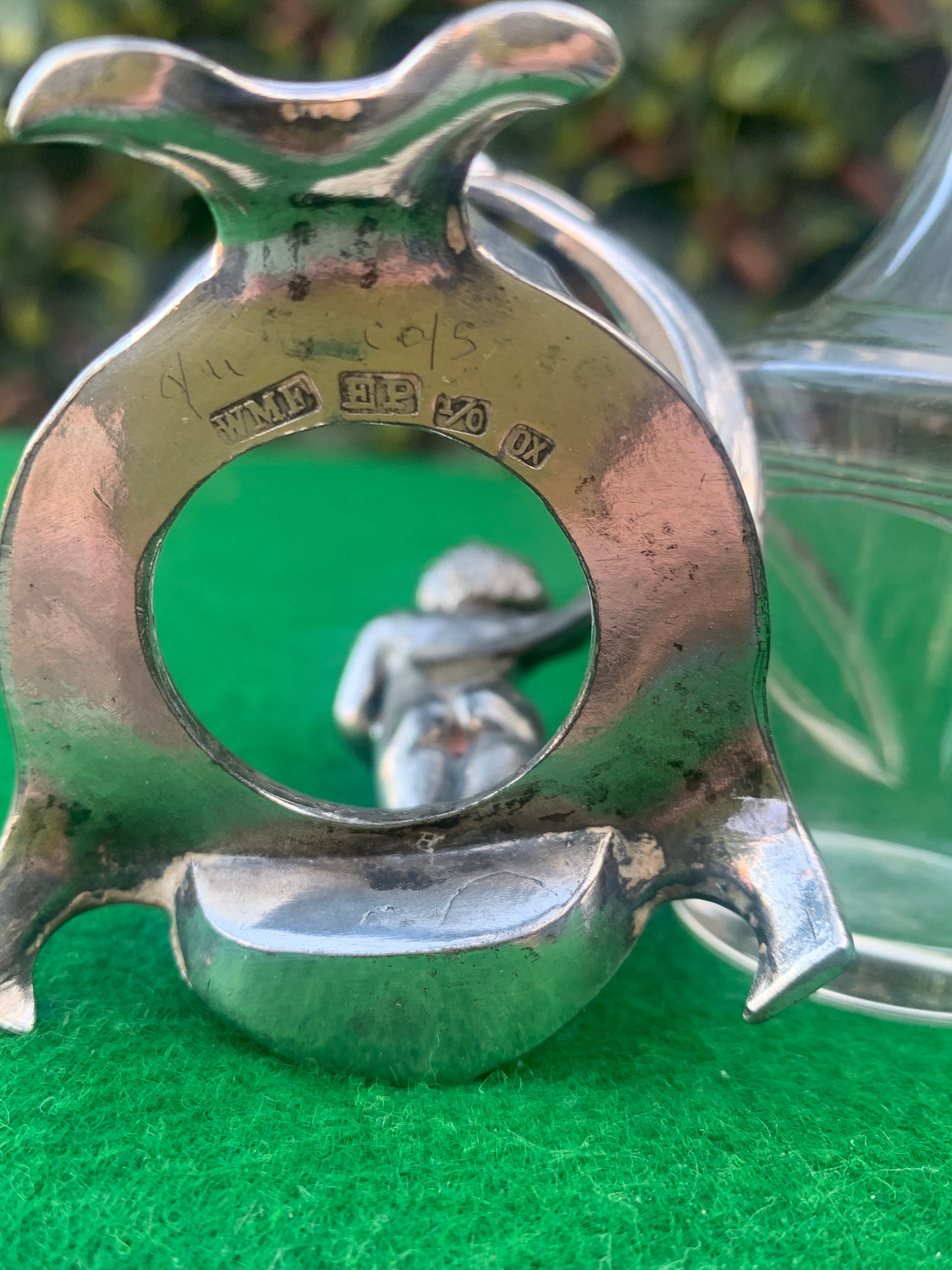 Art Nouveau (1890-1910) WMF (Württembergsche Machin Fabrik) glass scent bottle in stylised silver plated metal holder. Decorated with small cherub/child holding a bouquet. Stamped marks to base. 11cms high.