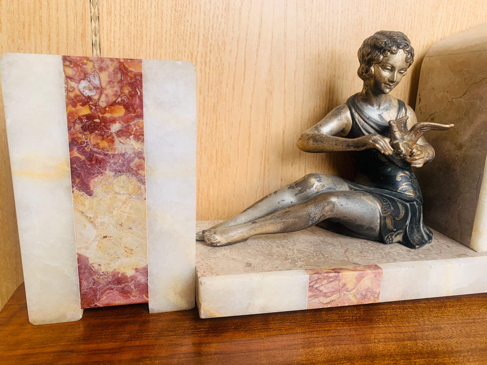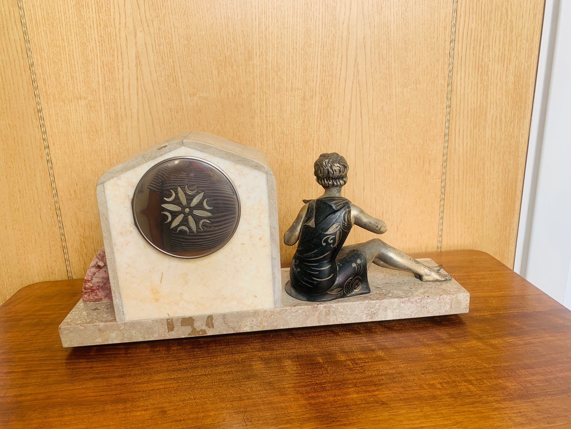 - An elegant seated female figure, cast in Spelter (a metal alloy used for decorative sculptures) with a silvered & bronze-toned finish, rests gracefully on the marble base.