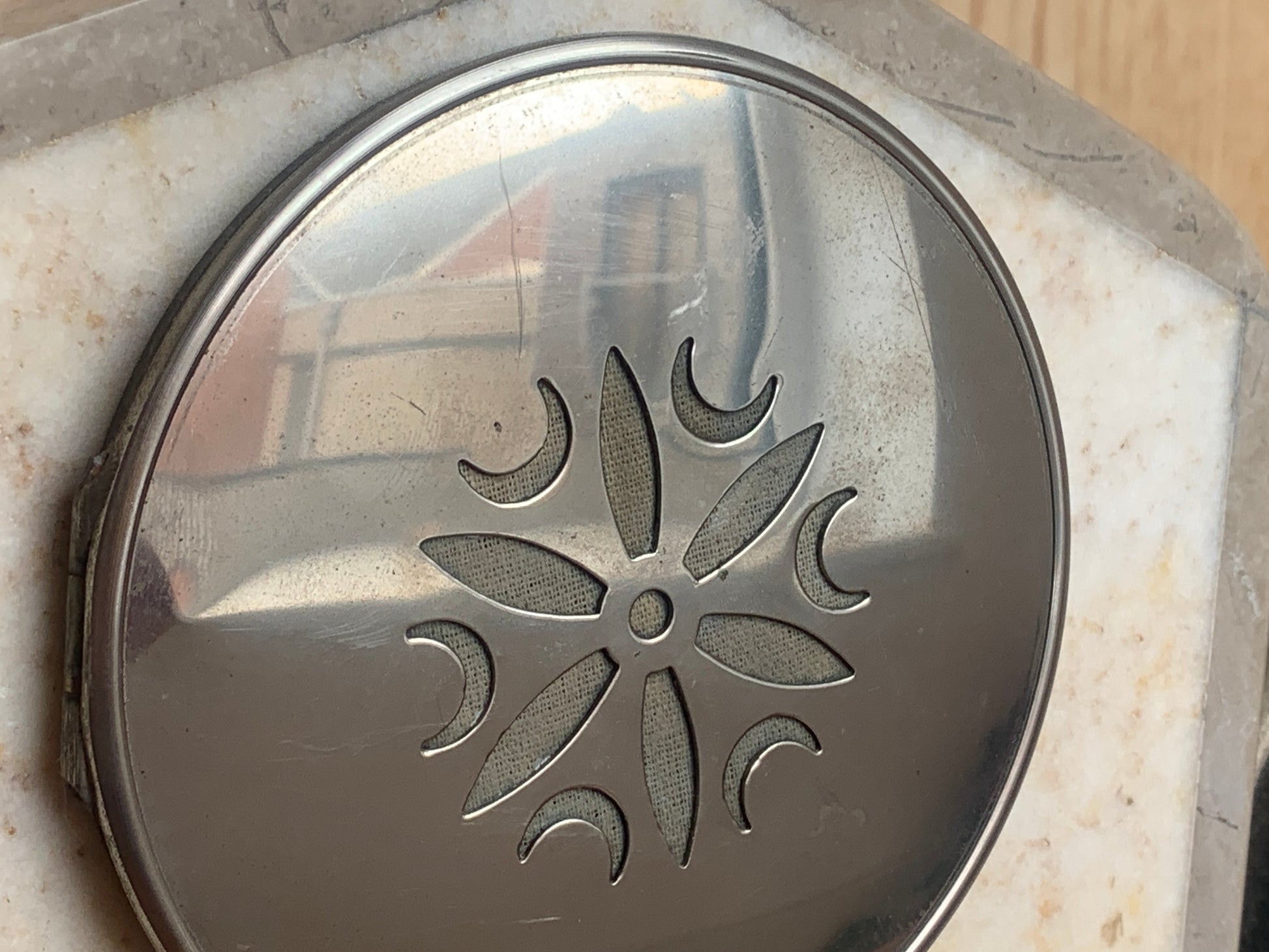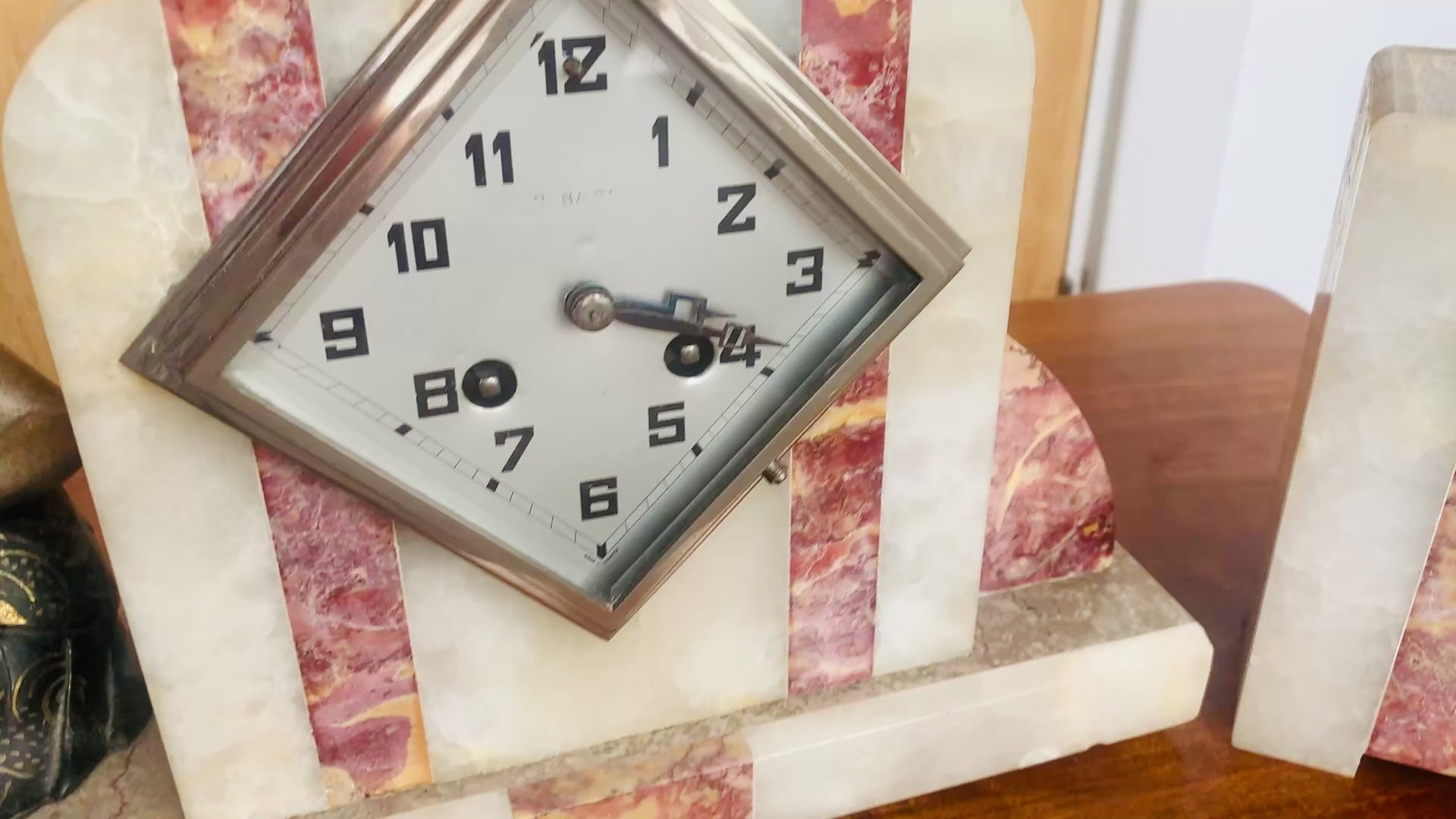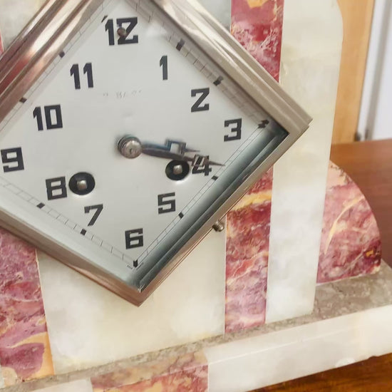 - The central clock unit is mounted within the marble and features a bold, geometric diamond-shaped metal bezel.