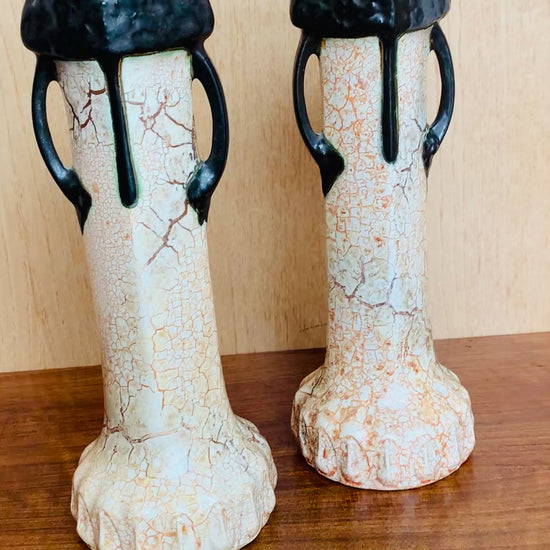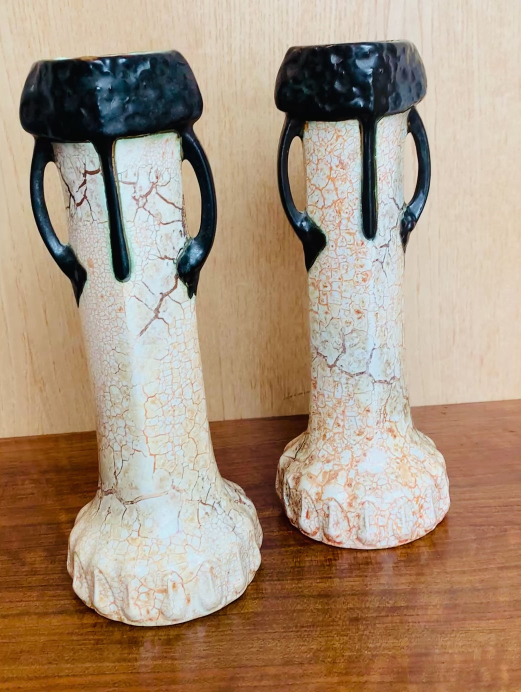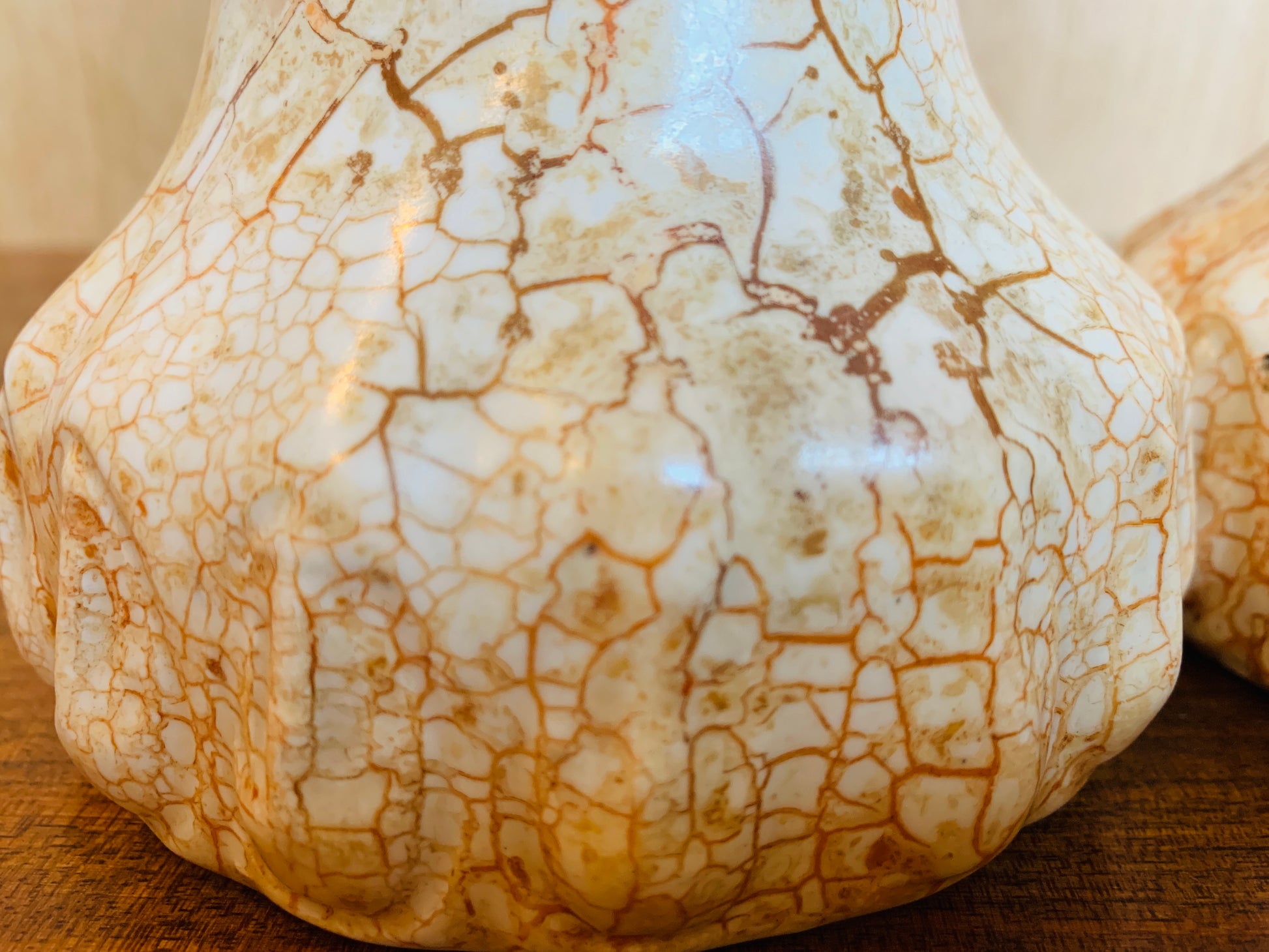Ditmar Urbach was a prominent Czech pottery manufacturer known for its Art Deco and Mid Century designs. The company, formed in 1919 by the merger of the Brothers Urbach and the factory of Rudolf Ditmar, produced a wide range of ceramics, including vases, jugs, and decorative items like animal figurines. Many items are sought after for their unique designs and hand-painted finishes, with some popular examples being the Art Deco 'Alienware' pieces such as the vases you see here. These Art Deco (1919 - 1939) vases feature a distinctive crackle glaze, (hence the Alienware) which has a marbled effect of gold on an ivory background. These collectors vases are in excellent condition.