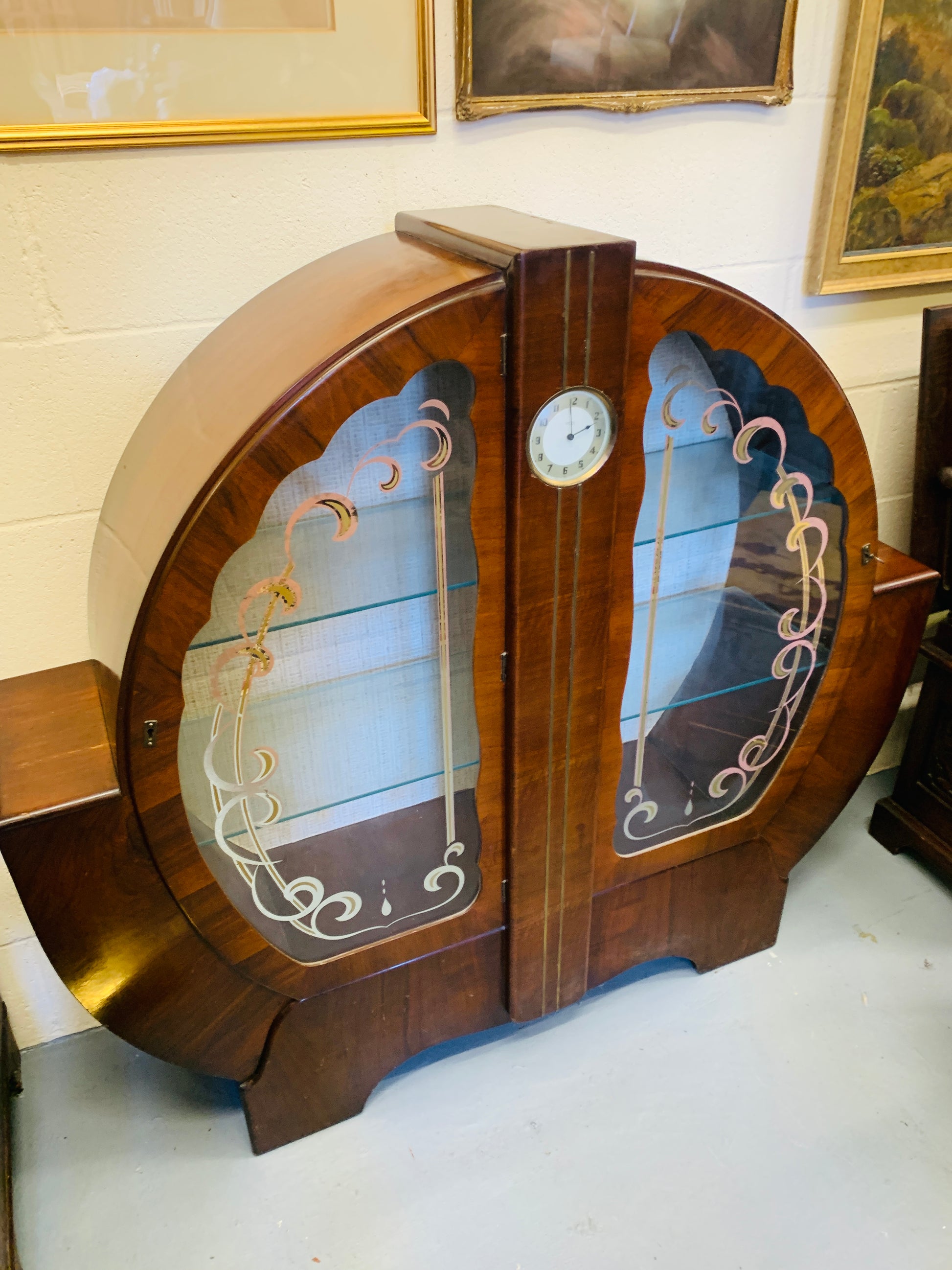 1930s Art Deco Cocktail Cabinet Curved Walnut Bar With Etched Glass & Integrated Smiths Clock