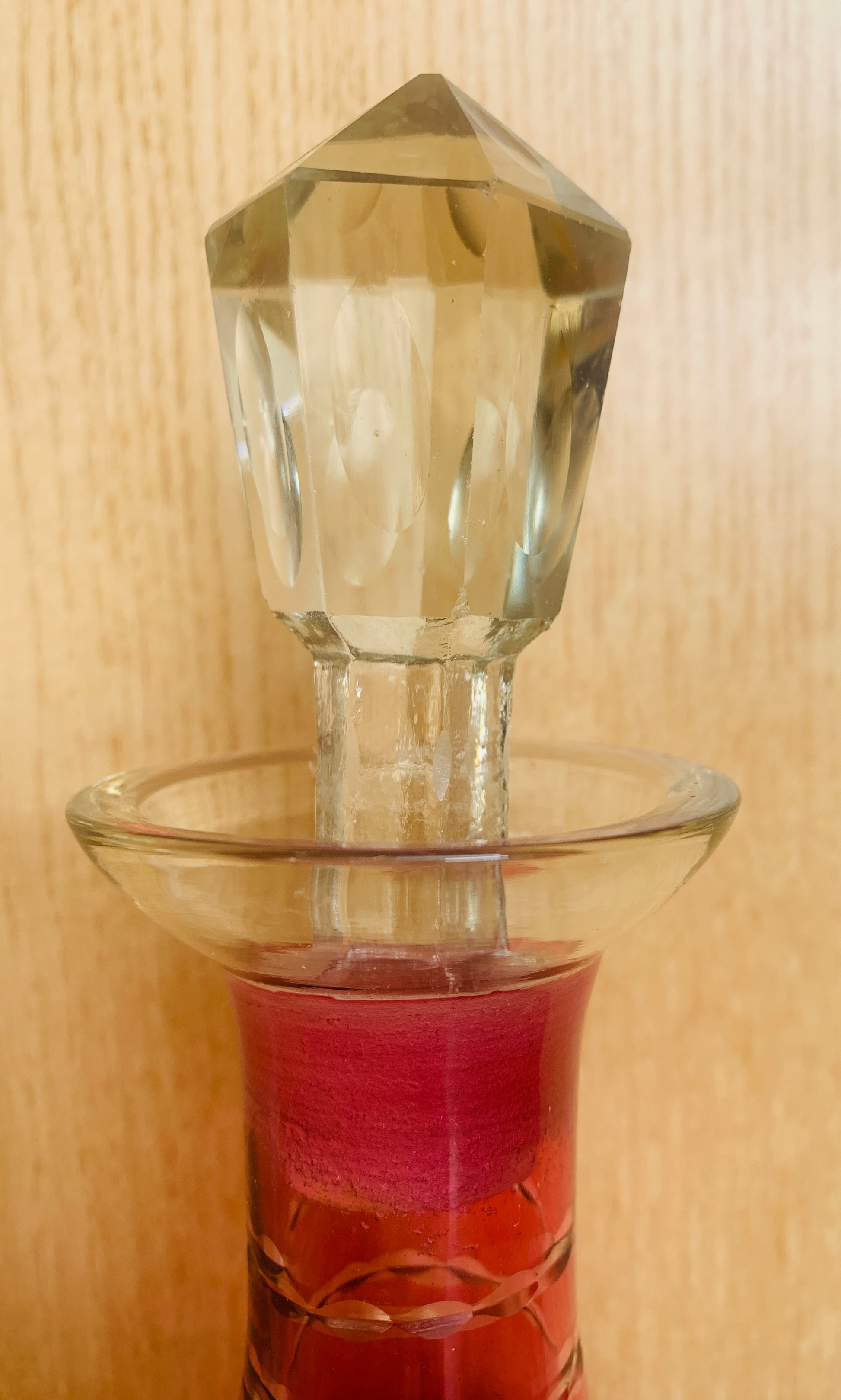 Elevate your home bar or collection with this absolutely gorgeous vintage cranberry glass decanter. The vibrant, deep ruby-red glass (sometimes called "cranberry" or "ruby red") is perfectly complemented by the hand-cut diamond pattern that wraps around the body, catching the light beautifully.